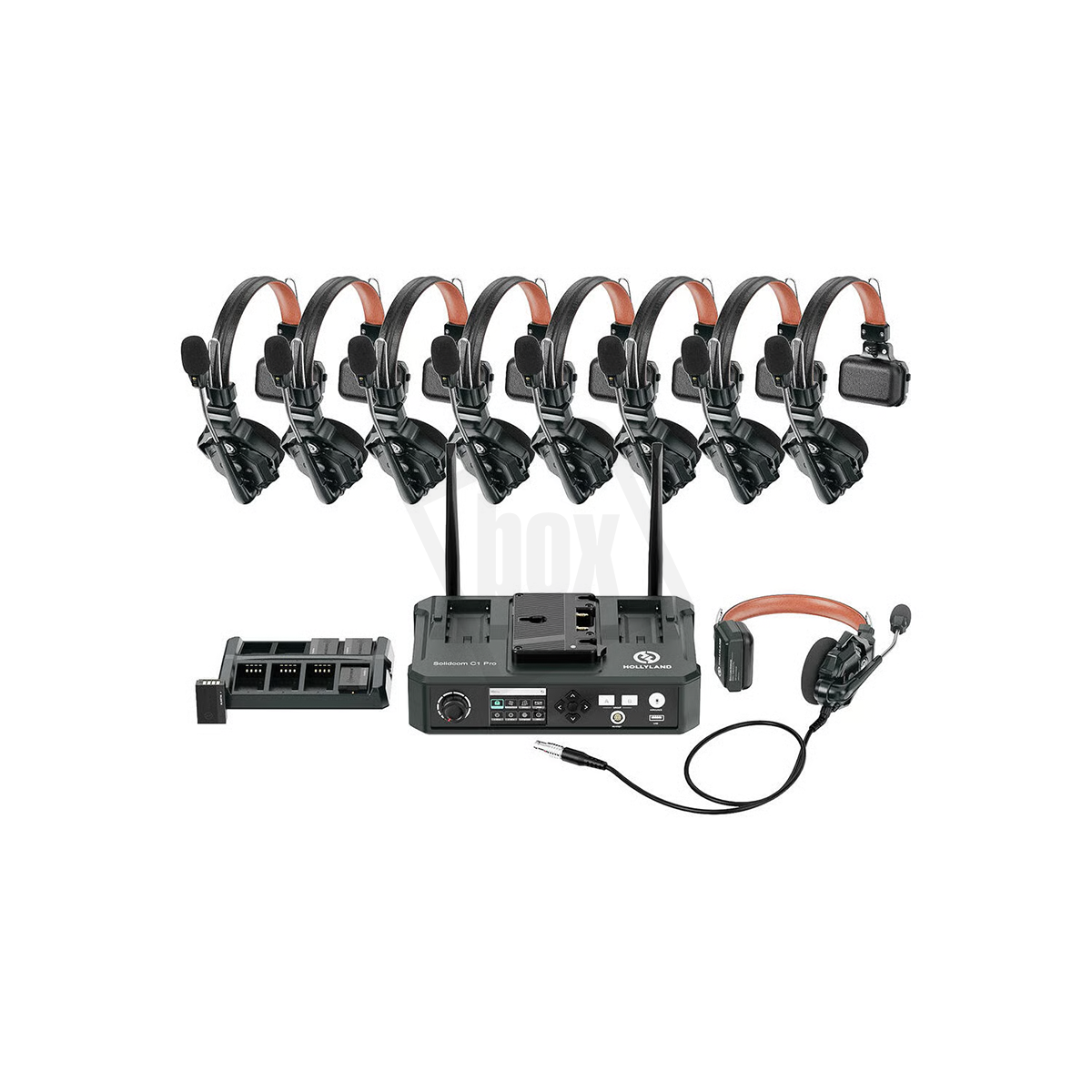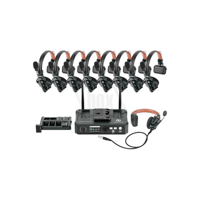 Draadloos intercomsysteem met 8 headsets en centrale hub. Volledige duplexcommunicatie voor efficiënte coördinatie op set of event.