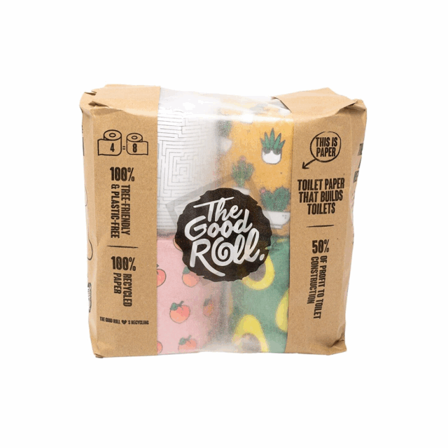 Gerecycleerd toiletpapier in kleurrijke verpakking (4 rollen). Duurzaam én opvallend voor backstage, eco-events of sets met visueel oog voor detail.